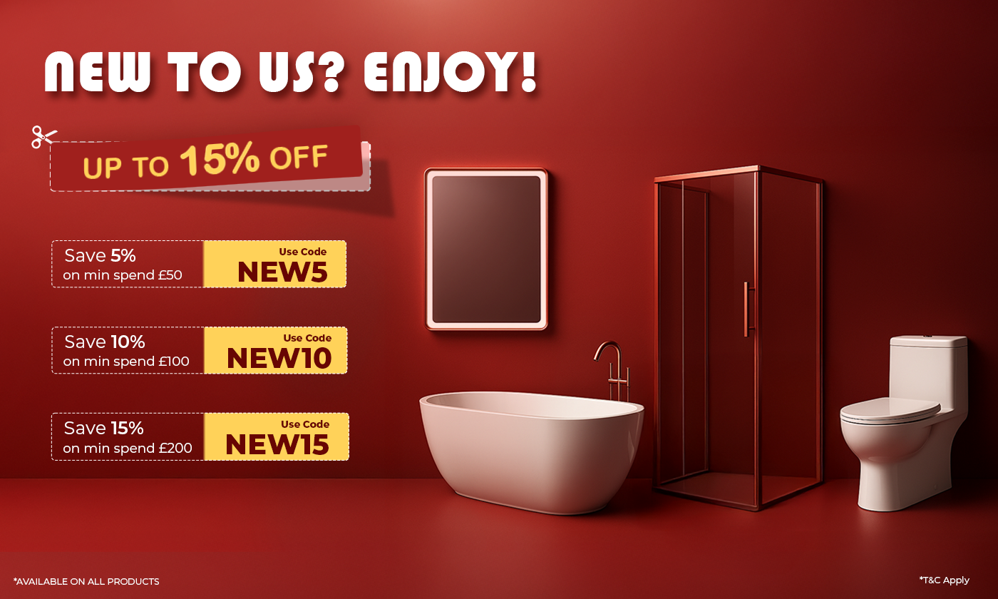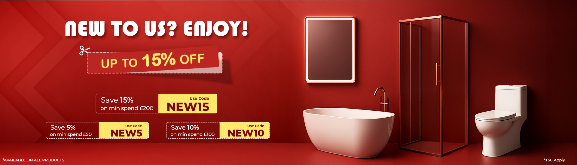 - Exclusive Bathroom Sale UK: Apply NEW5 for 5% OFF on orders over £50, NEW10 for 10% OFF on orders over £100, or NEW15 for 15% OFF on orders over £200. Save instantly across the full range including bathroom furniture, showers, radiators, accessories, and more.