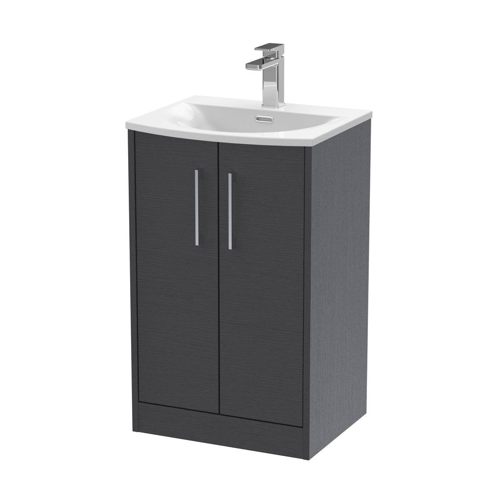 The Hudson Reed Juno Floor Standing 2-Door Vanity Unit with Curved Basin in Graphite Grey Woodgrain is a 500mm sink vanity unit that combines natural woodgrain texture with soft, rounded styling for contemporary bathrooms. With its compact design and elegant curved basin, this floor standing vanity unit is perfect for cloakrooms, guest bathrooms, or en-suites where both space and style matter. The textured graphite finish adds depth, warmth, and a designer touch to any modern interior.