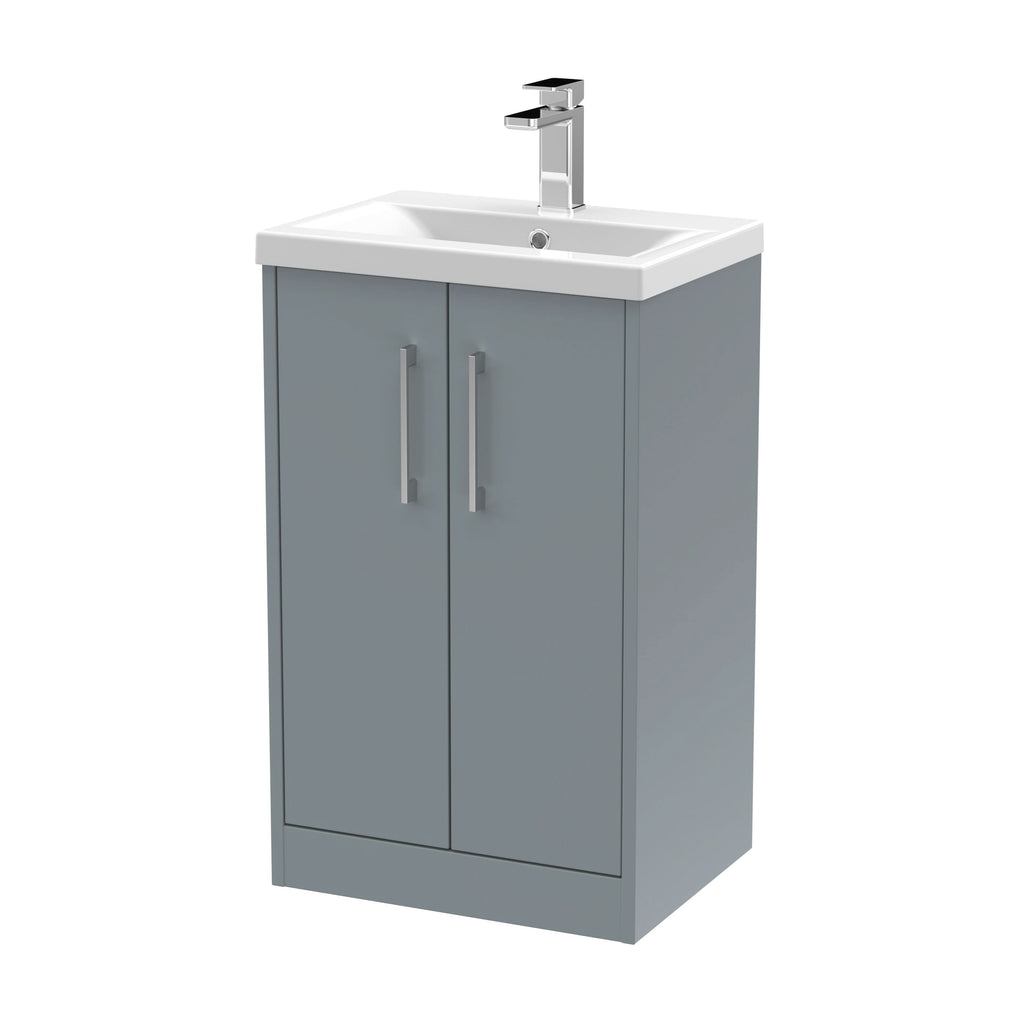 Constructed from moisture-resistant MFC, this floor standing vanity unit is durable and suited for everyday bathroom conditions. The included vitreous china basin features a practical mid-edge design and is pre-drilled with 1 tap hole, ready for pairing with a monobloc tap. Soft-close double doors open with modern D-shape handles and are fitted with 95-degree clip-on hinges for quiet, smooth operation.