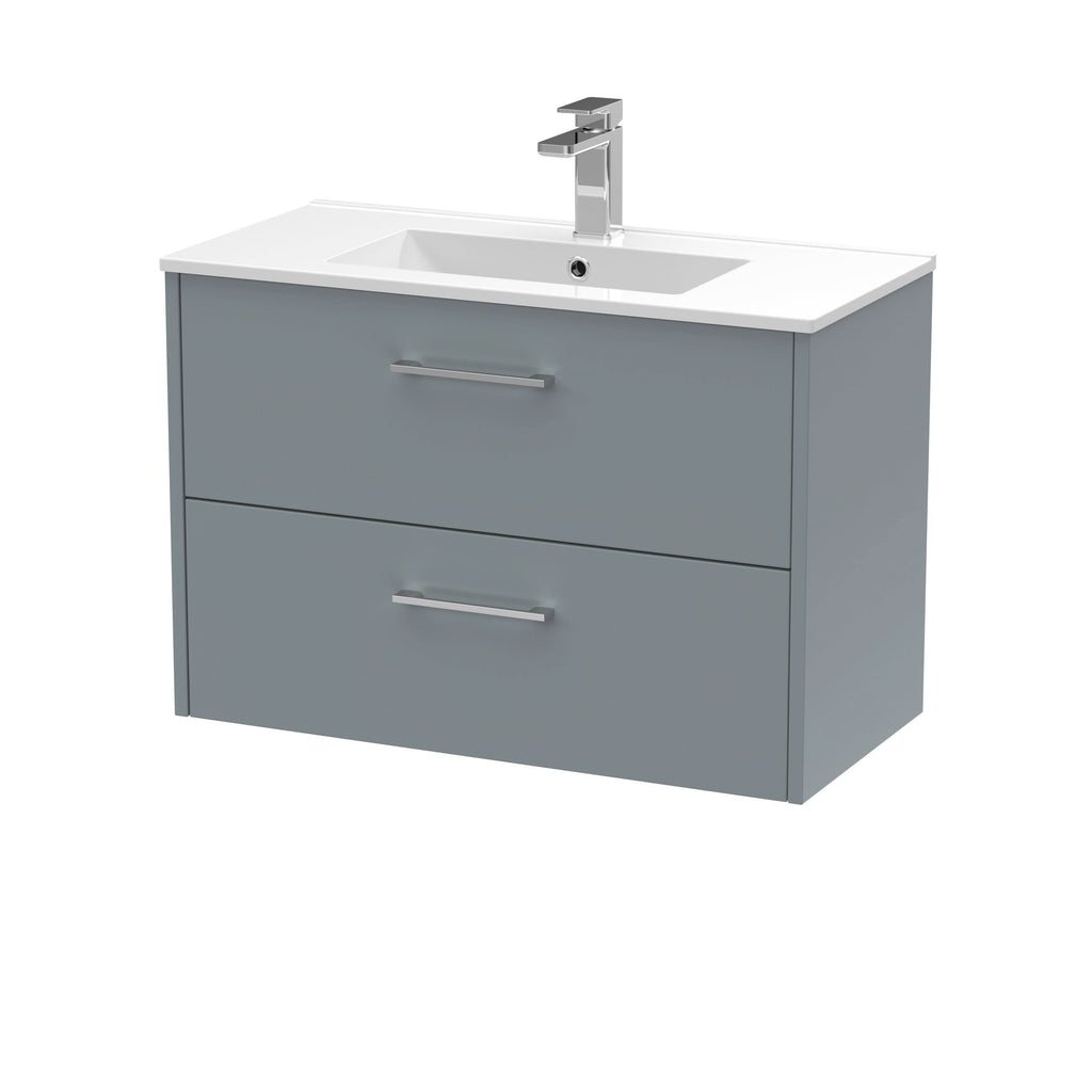 The Hudson Reed Juno Wall Hung 2-Drawer Vanity Unit with Minimalist 1 Tap Hole Basin in Coastal Grey is a sleek and spacious sink vanity unit designed for contemporary bathrooms. At 800mm wide, this floating unit provides generous drawer storage while maintaining a streamlined, space-enhancing look.