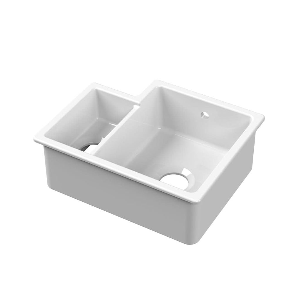 The smooth non-porous glaze ensures effortless cleaning, while the crisp white finish complements a variety of kitchen styles and worktops. Its dual bowl design allows for versatile kitchen tasks, from washing vegetables to cleaning dishes, making it highly practical for everyday use.
