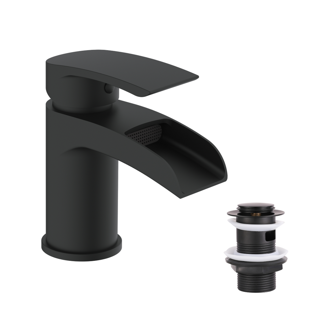 The Symphony Round Waterfall Mono Basin Mixer Tap with Waste in Matt Black seamlessly blends elegance and functionality. Its sleek design incorporates a graceful waterfall spout, adding a touch of luxury to any bathroom. Crafted with durability in mind, this mixer tap ensures smooth operation and precise water control. Complete with a waste system, it offers both convenience and style, making it a perfect choice for modern bathroom aesthetics.