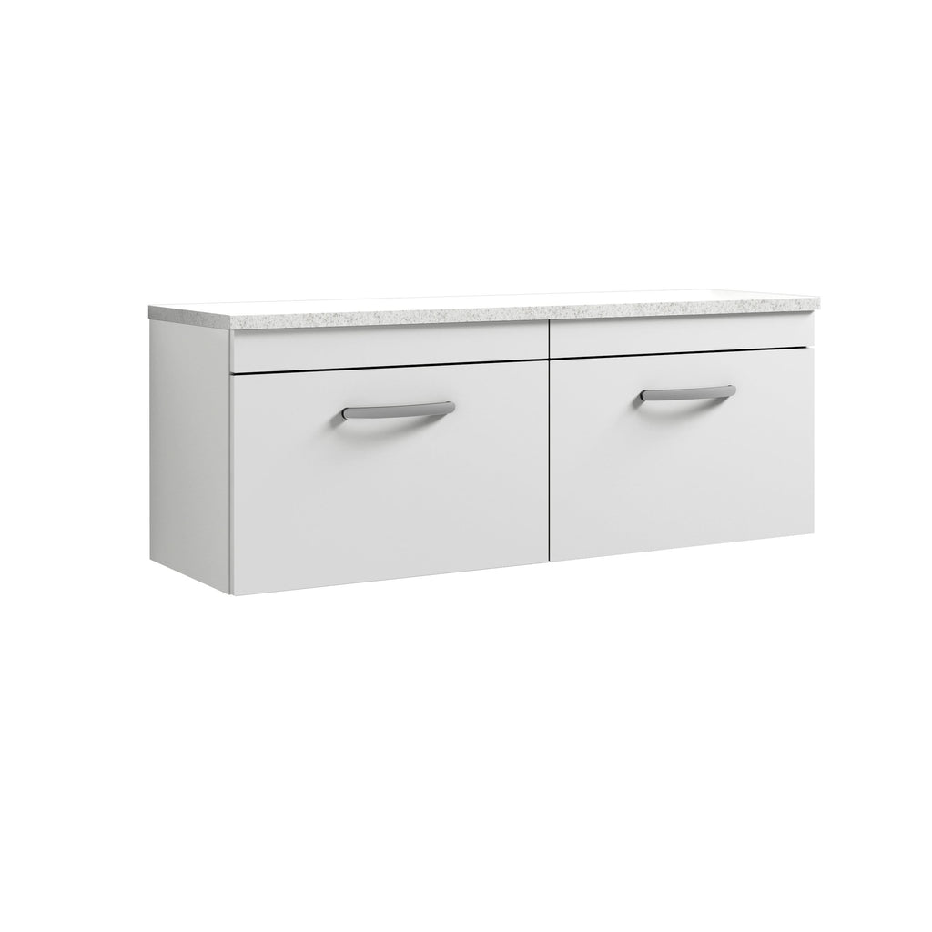 The Nuie Arno Wall Hung Vanity Unit with 2 Soft-Close Drawers & Bellato Grey Laminate Top is a refined and practical addition to any contemporary bathroom. At 1200mm wide, this generous countertop basin unit delivers impressive storage while maintaining a sleek, minimalist design. The crisp gloss white finish is complemented by the textured Bellato Grey laminate top, offering a soft contrast and a surface that’s both stylish and durable. Designed for use with one or two vessel basins (sold separately), this modern vanity unit balances visual appeal with daily functionality.