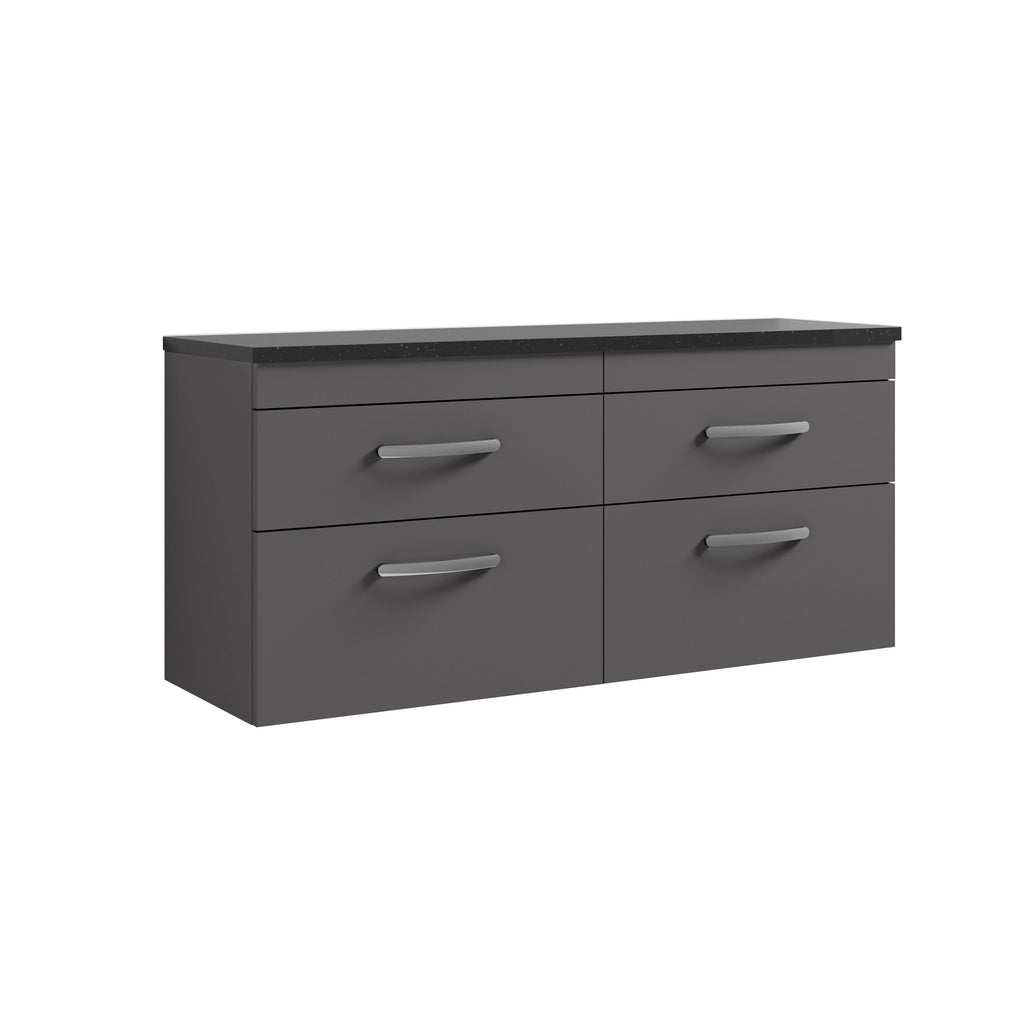 The Nuie Athena Wall Hung 4-Drawer Vanity Unit in Gloss Grey is a contemporary storage solution that blends modern style with everyday practicality. Paired with a co-ordinating Black worktop, this counter top vanity unit provides a durable and striking surface for your chosen countertop basin unit, adding a bold contrast to the sleek Gloss Grey finish. At 1200mm wide, it is the ideal choice for bathrooms that require both generous storage and a luxurious, modern aesthetic.