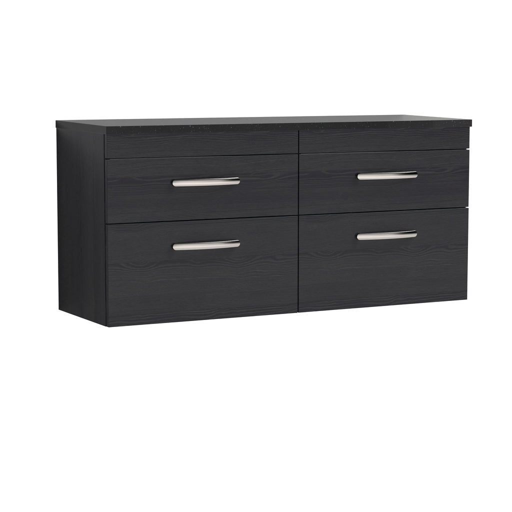 The Nuie Athena Wall Hung 4-Drawer Vanity Unit with Sparkling White Laminate Worktop delivers striking contrast and functional elegance in a spacious 1200mm design. Finished in richly textured Charcoal Black woodgrain and topped with a glitter-infused Sparkling White surface, this counter top vanity unit adds a clean, contemporary aesthetic to modern bathroom interiors. Designed to support one or two vessel basins (sold separately), the wide laminate top provides practical surface space with a luminous finish.