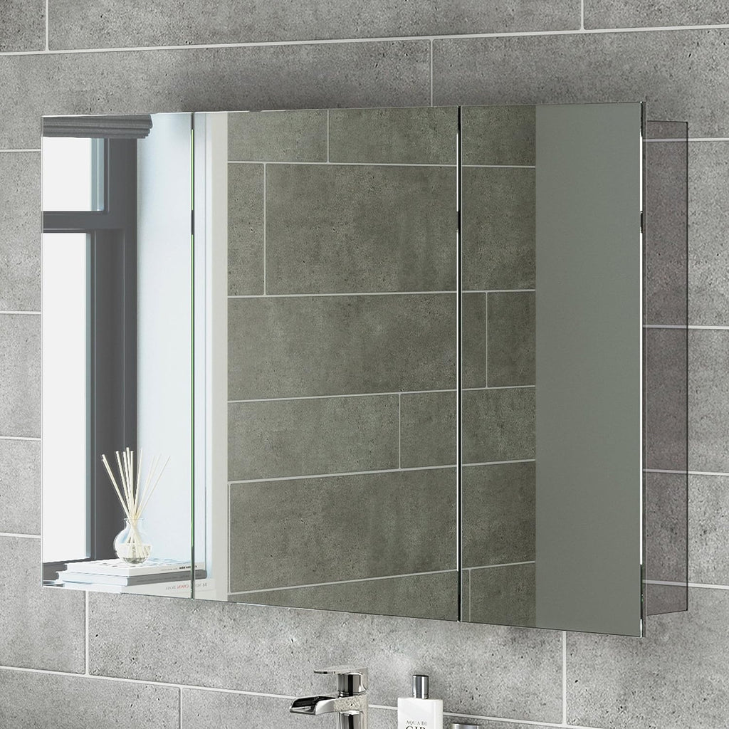 iBathUK Oslo Wall Mounted Mirror Cabinet, Triple Door Bathroom Wall Cabinet in 5 Shelves with Mirror, Modern Storage Unit with Bathroom Mirror in Landscape Orientation in Silver, 600 x 900mm