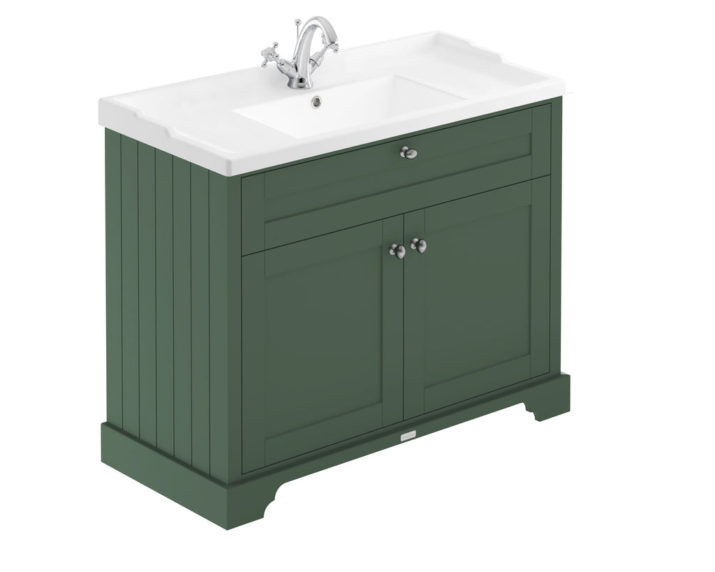 The Old London 1000mm Floor Standing Vanity Unit with Ceramic Basin is designed to bring classic elegance and useful storage to any traditional bathroom setting. Finished in a rich Hunter Green and crafted with soft-close doors, this vanity unit with basin delivers both visual impact and everyday practicality. The ceramic basin includes a single tap hole and pairs beautifully with the traditional knob handles and smooth matt vinyl finish. With FSC-certified MDF construction and supplied rigid for fast installation, it a reliable and eye-catching centrepiece.