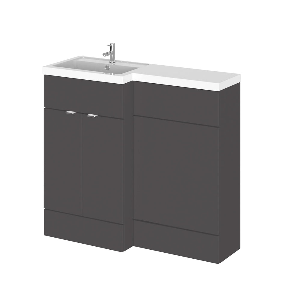 The Hudson Reed Fusion Floor Standing 2 Door Vanity Basin & WC Left Hand Combination, 1000mm in Gloss Grey combines style, practicality, and durability. Its full-depth storage, ready-built design, and high gloss finish make this bathroom sink and vanity unit a functional and elegant addition to modern bathrooms.