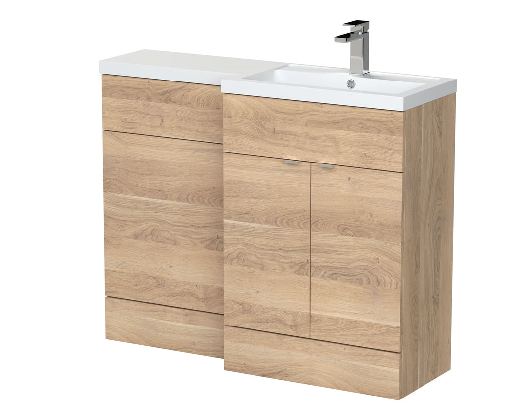 The Hudson Reed Fusion 1100mm Right Hand Combination in Bleached Oak is a stylish and practical bathroom storage unit that combines a vanity basin and WC in one integrated design. At 1100mm wide, this sink vanity unit provides generous storage while introducing a warm, contemporary finish to your bathroom. The bleached oak fascia adds subtle colour and natural texture, creating a modern yet inviting aesthetic that complements a wide range of interiors.
