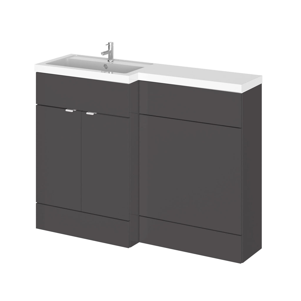 The Hudson Reed Fusion Floor Standing 2 Door Vanity Basin & WC Left Hand Combination, 1200mm in Gloss Grey combines modern style with practical functionality, making it an excellent choice for contemporary family bathrooms. The high gloss grey finish adds a sleek, contemporary touch and creates a stylish focal point while coordinating perfectly with other fitted furniture, ensuring this sink vanity unit enhances your bathroom furniture storage.
