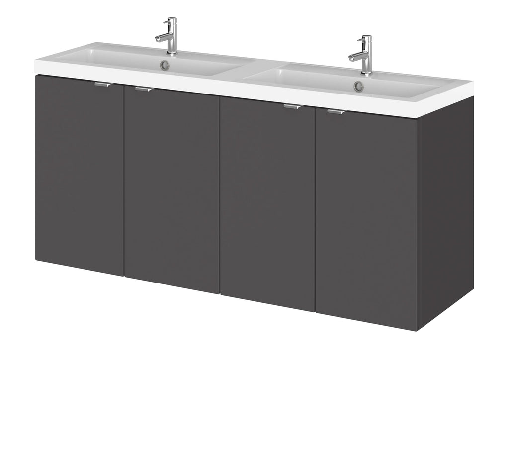 The Hudson Reed Fusion Wall Hung 4 Door Vanity Unit & Twin Polymarble Basin, 1200mm in Gloss Grey combines style, practicality, and durability. Its full-depth storage, ready-built design, and modern wall hung layout make this bathroom sink and vanity unit a functional and elegant addition to contemporary bathrooms.