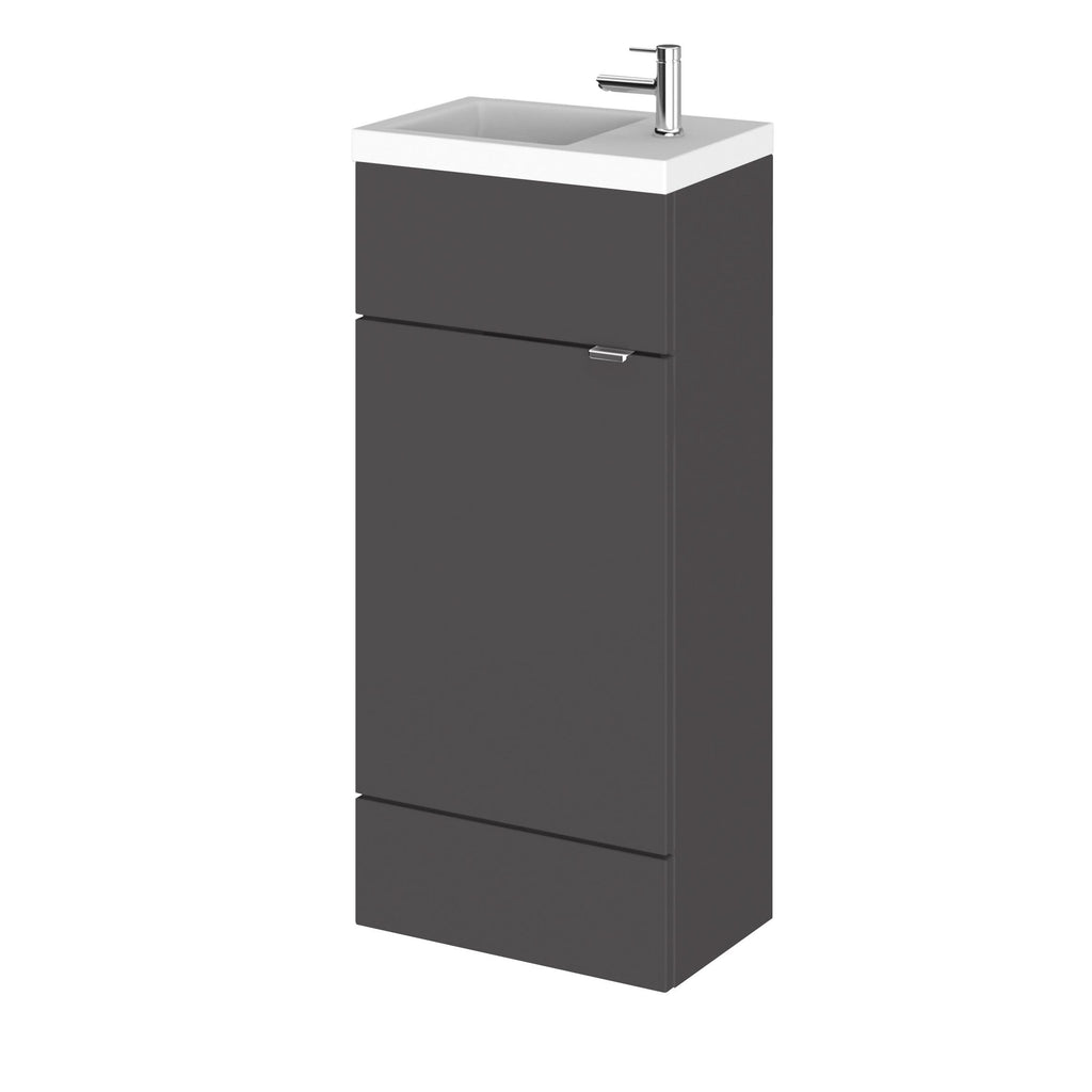 The Hudson Reed Fusion Floor Standing 1 Door Vanity Unit & Polymarble Basin Compact in Gloss Grey, 400mm is a stylish and practical bathroom storage unit, combining a single-door vanity unit with a durable polymarble basin for a sleek, contemporary finish. Perfect for cloakrooms or smaller bathrooms, this bathroom furniture storage solution provides essential storage while keeping your bathroom sink vanity unit organised and surfaces clutter-free.