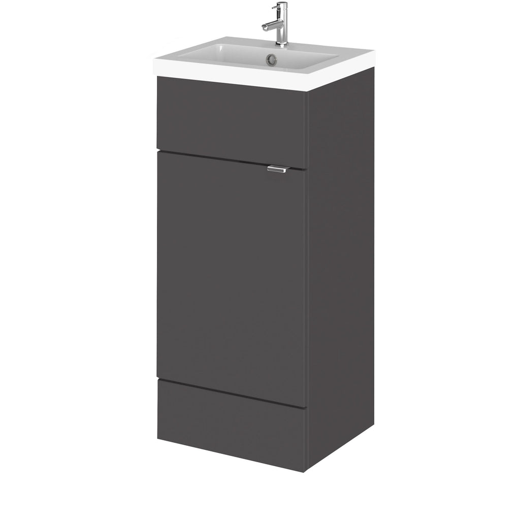 The Hudson Reed Fusion Floor Standing 1 Door Vanity Unit & Polymarble Basin, 400mm in Gloss Grey combines style, practicality, and durability. Its compact full-depth storage, ready-built design, and high gloss finish make this bathroom sink and vanity unit a functional and elegant addition to modern bathrooms.
