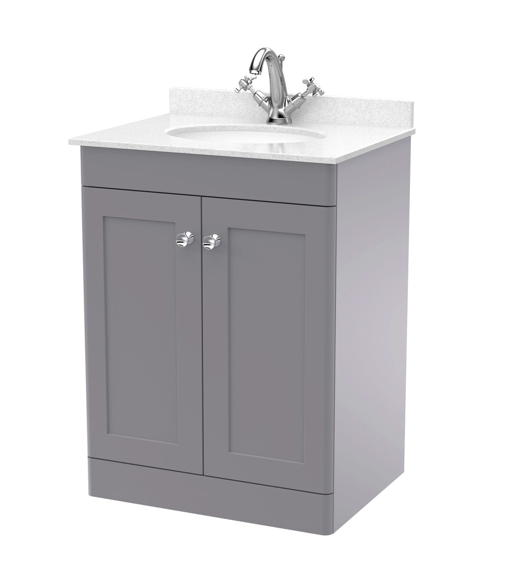 The Nuie Classique Floor Standing 2 Door Vanity Unit & 1 Tap Hole White Marble Top with Oval Basin captures the elegance of traditional design with modern functionality, making it an ideal centrepiece for classic and transitional bathrooms. The Satin Grey finish adds a refined touch to the panelled double doors, while chrome knob handles enhance its timeless character. Compact at 600mm wide, this floor standing vanity unit delivers style and storage in a space-efficient footprint, perfect for en-suites and smaller bathrooms.