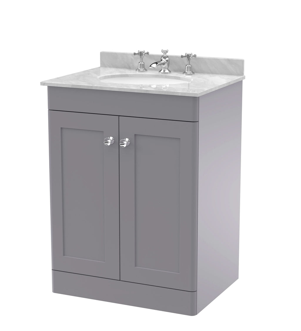 The Nuie Classique Floor Standing 2 Door Vanity Unit & 3 Tap Hole Grey Marble Top with Oval Basin effortlessly blends traditional elegance with everyday function, making it a standout choice for classic bathroom spaces. Finished in a soft Satin Grey, this vanity unit with basin features panelled double doors and traditional chrome knob handles, offering period charm in a space-saving 600mm floor standing format. Perfectly suited for smaller bathrooms and en-suites, it delivers a balanced combination of storage, style, and durability.