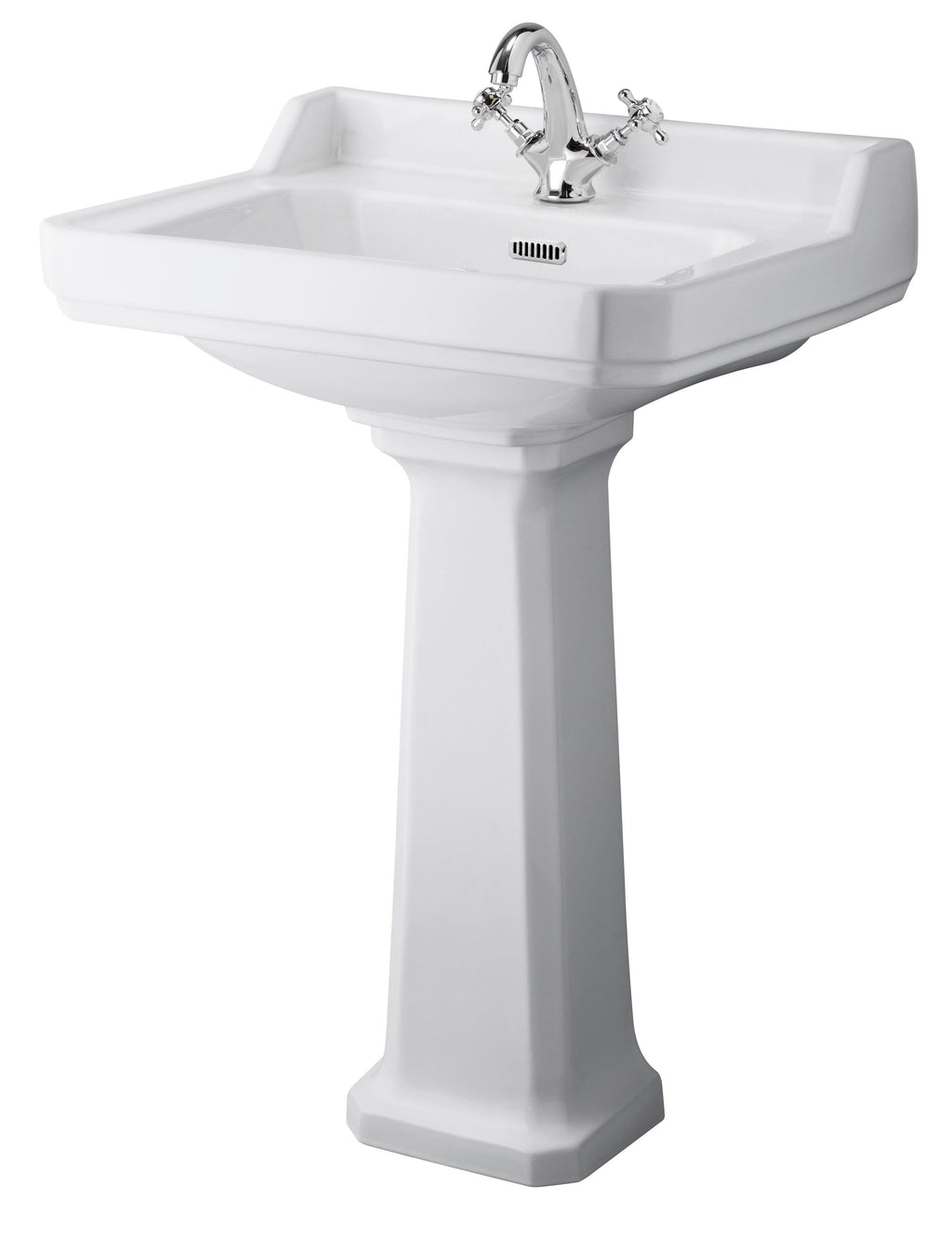 The Old London Richmond 600mm Basin & Pedestal 1 Tap Hole, Premium Basin with Pedestal, White combines traditional elegance with practical functionality, making it a refined choice for both classic and contemporary bathrooms.