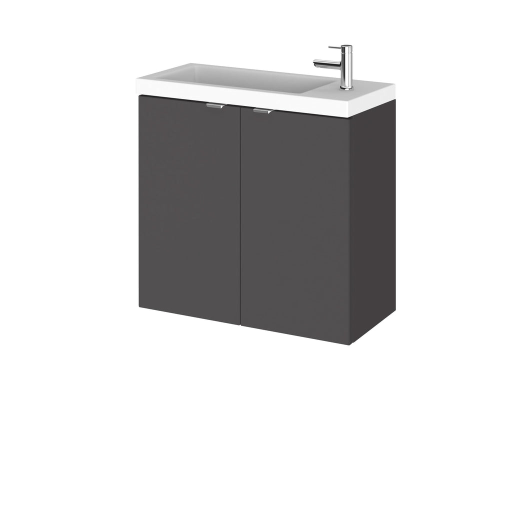 The Hudson Reed Fusion Wall Hung 2 Door Vanity Unit & Polymarble Basin, 600mm in Gloss Grey combines sleek contemporary design with practical functionality, making it an ideal choice for modern bathrooms. The high gloss grey finish adds a polished and sophisticated touch while coordinating seamlessly with other fitted furniture, ensuring this vanity unit with basin enhances your bathroom furniture storage.