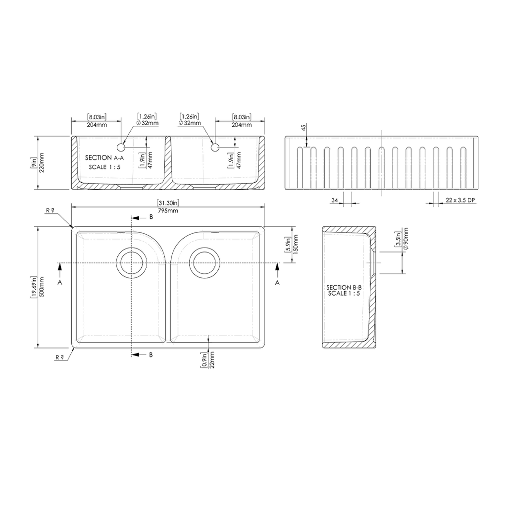 The fluted front apron introduces a touch of character and traditional charm, while the flush weir design ensures smooth water drainage with a neat, streamlined finish. An integrated overflow adds safety and convenience, preventing accidental spills. Each sink is hand-finished by skilled artisans, ensuring authenticity, premium quality, and unique craftsmanship that elevates your kitchen design.
